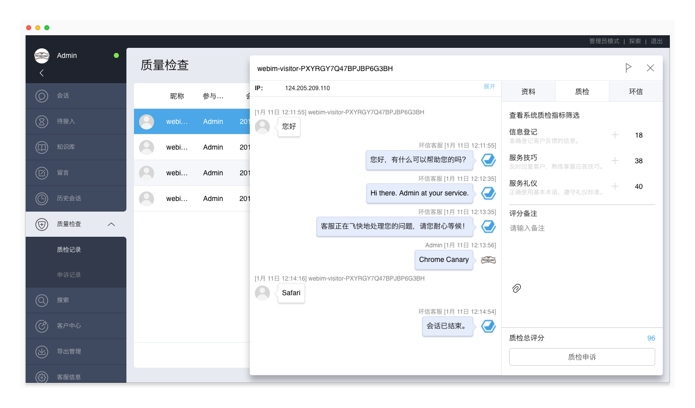 在质量检查页面的列表中,点击任意会话,可以查看该会话的详细质检评分和备注。