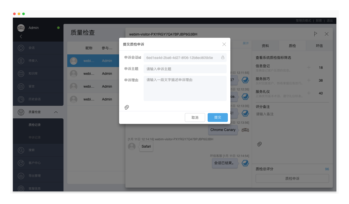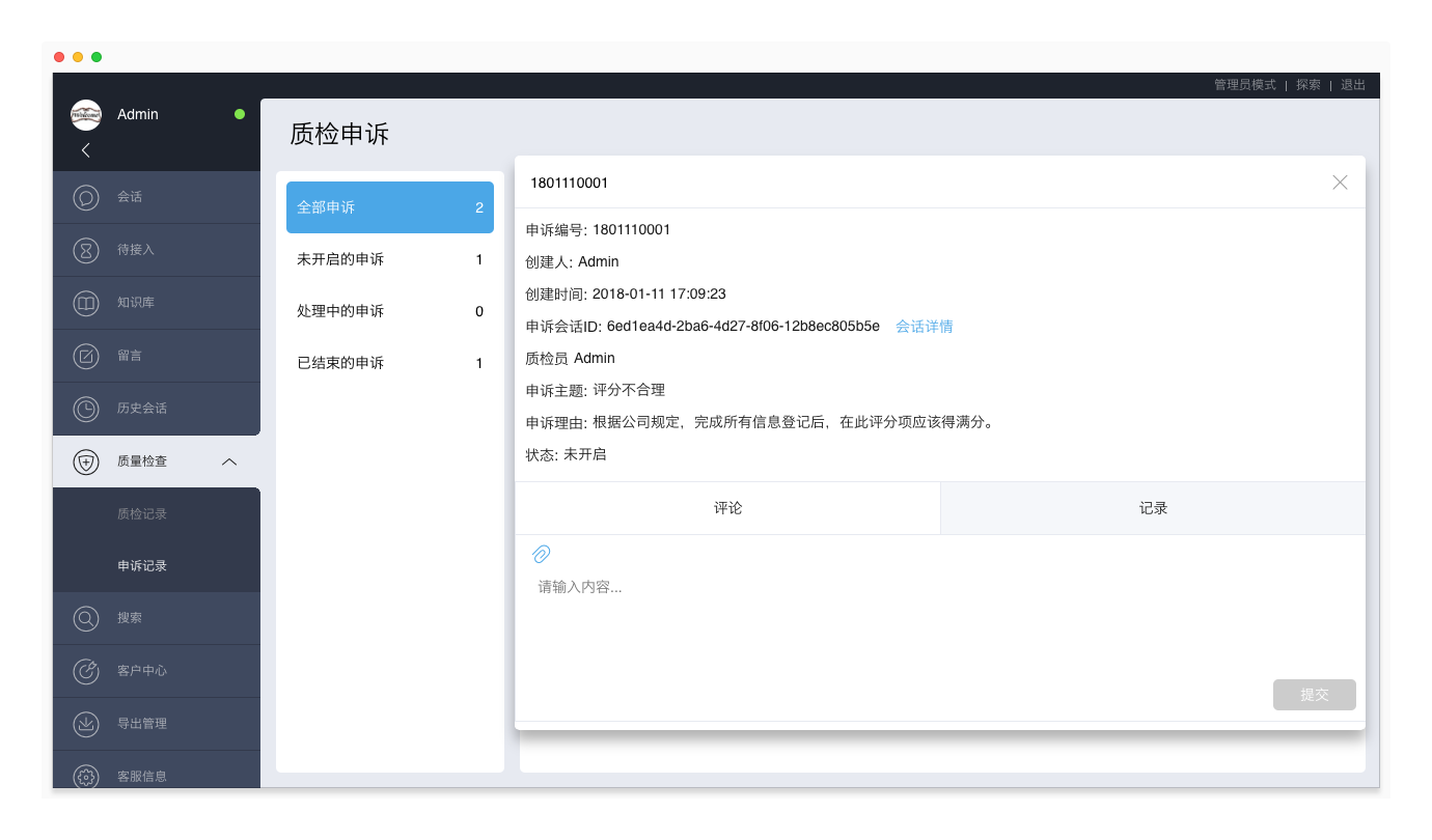 新增质检申诉功能,用于质检员完成会话质检后,客服可以向打分的质检员发起申诉,提交证据并要求复核质检结果。客服对质检结果发起申诉后,管理员和质检员可以查看客服的质检申诉详情,并对申诉进行处理。