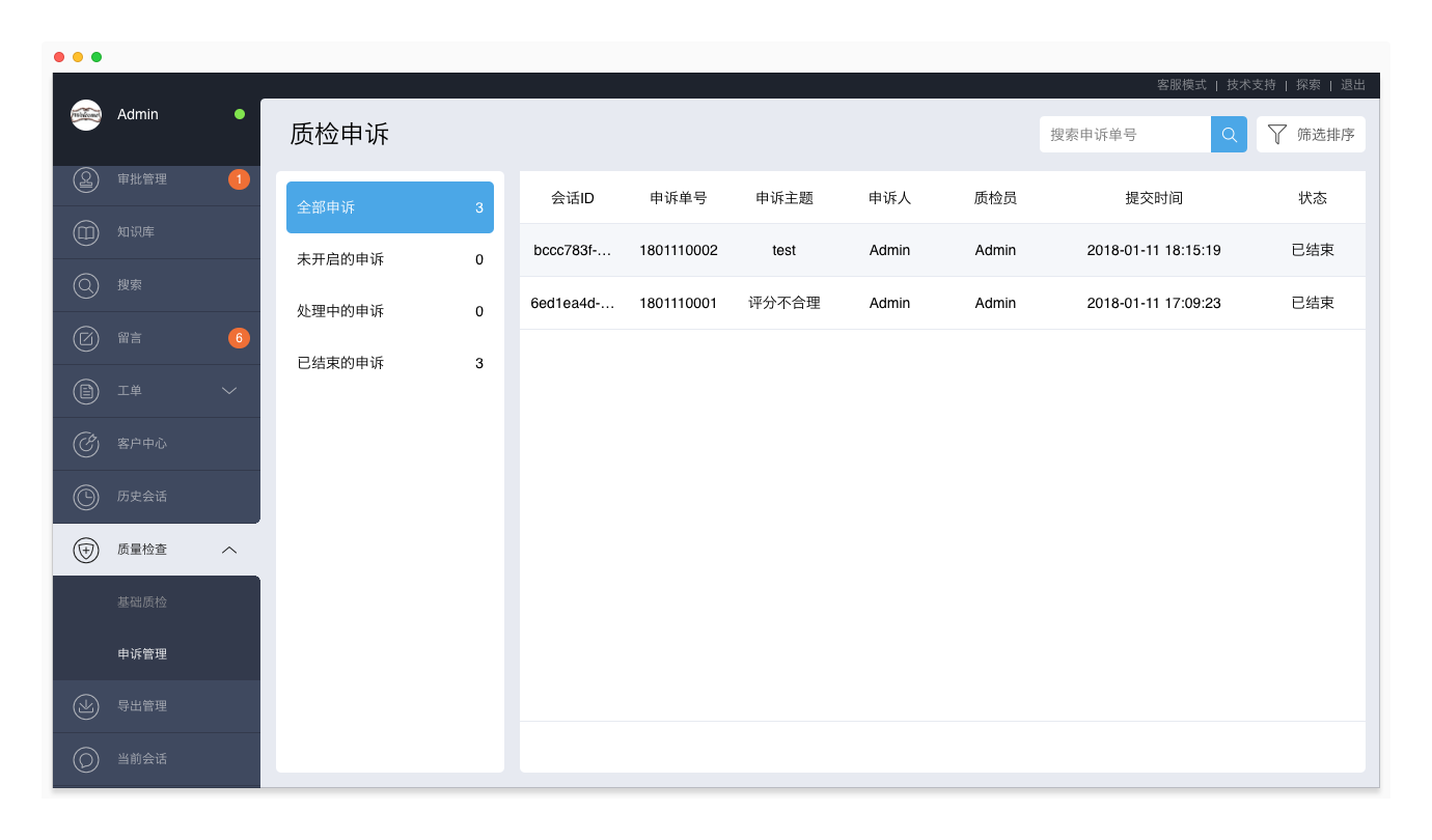 进入“管理员模式 > 质量检查 > 申诉管理”页面,查看所有未开启、处理中、已结束的质检申诉单。支持根据申诉单号搜索申诉单,以及支持根据时间段、申诉人筛选申诉单。