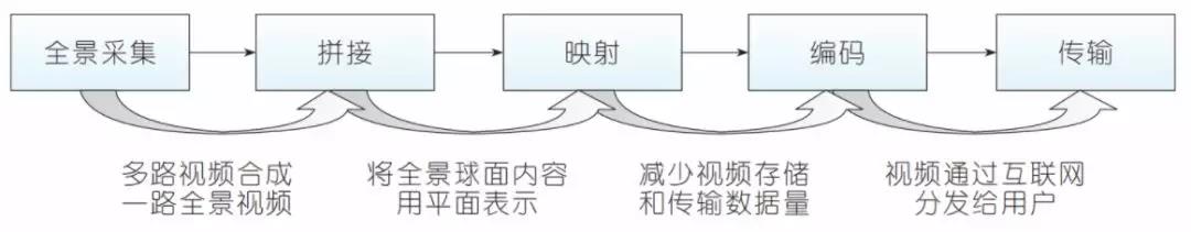 如上图所示,从全景采集到网络分发,再到对用户端方面的多终端适配播放,实现 VR 直播的各个环节都需要较高的技术支持。