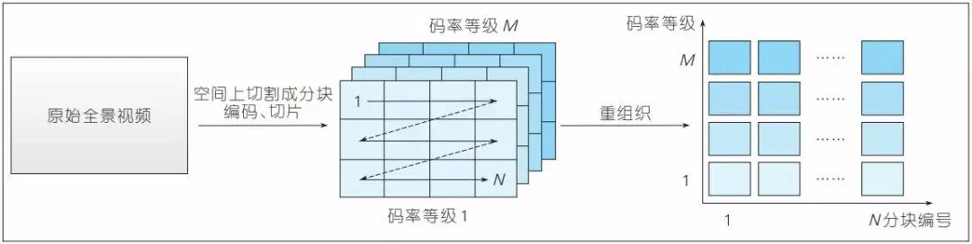 全景传输是指将全景视频以同等质量、完整的发送给用户,优点是保留信息量大,完整保留了原始球面视频的所有内容,而且可以直接使用现有的编码器和传输方式。但由于播放设备和视角的限制,用户在某一时刻只关心视角范围内的部分内容,导致造成较高的资源浪费,对带宽消耗大。