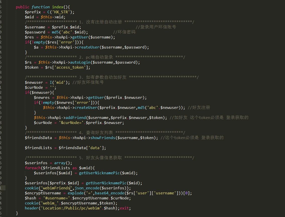 此步要先把网站上的用户注册一个环信账号,然后自动登陆跳过环信的登陆页面,然后把对方加为好友(此步如果对方没有环信账号也需要把好友注册一个环信账号)。上代码