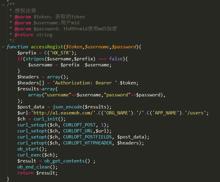 逻辑是这么实现的,因为在控制器里做的操作,所以登陆信息要保存在cookie里。里面的方法都可以在http://api-docs.easemob.com/%2 ... token这个环信的服务器端集成Swagger文档里找到,然后用Curl调用,或者一个更简单的方法,有一个完整的类可以用,链接在此https://github.com/easemob/emc ... t.php,简单的curl是这么用的