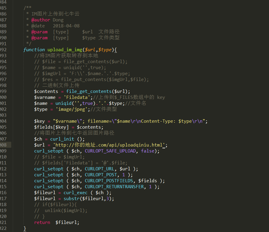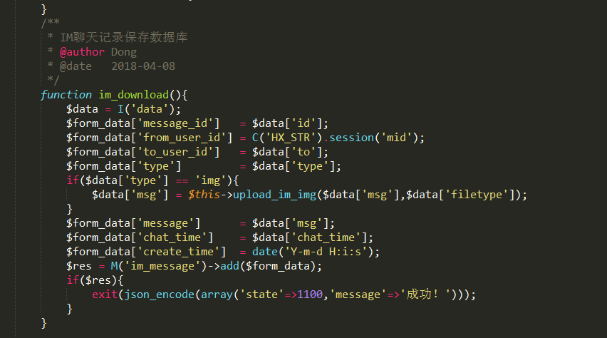 这个图片是图片上传方法,我在后台用CURL进行了上传操作,最开始我先把图片保存在了本地然后再上传,后来我找了二进制可以上传,改成了这个样子,值得注意的是我用CURL调用的url返回的值会有一个红色的符号,所以我用substr给它截掉了,之前没发现怎么都找不到图片。这里的接口就是一个普通的上传方法然后返回的是图片名称。这样聊天记录也保存完毕了。