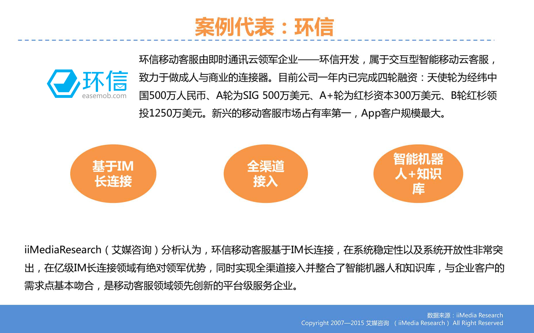 据悉,环信移动客服产品已经有国美在线、58到家、楚楚街9块9等大批互联网巨头企业签约,累计签约客服座席已经达4万个,据艾媒咨询《2015年中国移动客服市场发展研究报告》显示,环信移动客服在新兴的移动客服市场占有率第一。