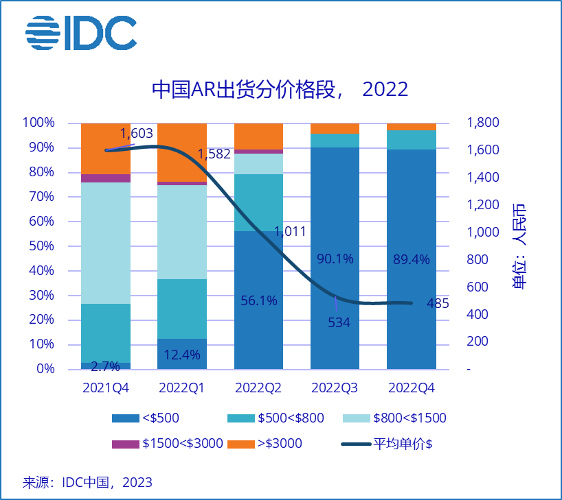 纵观2022,中国AR/VR硬件市场呈现以下主要特点: VR市场:出货渠道多元化,线下出货量占比持续提升 从Standalone VR产品型号来看, Pico Neo 3、Pico 4、Nolo CM1, 奇遇Dream Pro, 奇遇Dream 为2022年度出货Top 5型号,全年出货分别为50.5、21.7、6.6、5.4、2.4万台。 尽管疫情及电商节庆期间物流一定程度冲击了去年的消费者市场,但随着资本涌入和产品迭代的进度加快,2022年仍然呈现诸多亮点: 从产品配置来看,下半年厂商的主打产品基本转为pancake新品; 从定价上来看,基本维持在上代新品同等水平的价格区间; 从内容生态来看,健身开始成为重要的吸引力场景; 从销售渠道来看,Standalone VR产品的线下出货渠道占比在2022年提升明显,零售+品牌店通路全年出货占比达10.1%; 从厂商竞争格局来看,头部厂商的领先优势在2022年进一步扩大。 AR市场:消费级眼镜异军突起,平均单价持续走低 以初创公司为主的AR硬件厂商在2022年接连发布了消费级新品,价格和产品定位较为相似。由于往年AR产品主要为高价位的商用型号,新品涌入使得2022年AR产品的平均单价大幅下滑。到2022年第四季度,500美金以下的AR产品出货占比已经接近90%。当前绝大部分消费级产品仍需连接主机使用(手机、电脑等),最主要功能为扩展屏幕。从出货渠道上看,除个别产品型号大批量出货给特定商用最终用户外,以电商平台为主的线上渠道仍是主要通路。 2023年,厂商团队、产品策略、战略重点均将出现一定调整及变化 VR市场: 2023年,VR厂商均在一定程度上开始着力降本增效,这意味今年线上线下营销力度较2022年将有所减弱;同时,目前外界对于巨头入场期望值较高,这对国内厂商的新品发布计划可能有所影响。随着疫情影响逐步减小及整体经济状况回暖,厂商对于线下渠道的重视将继续增强,消费者在线下门店体验VR产品的门槛及成本将持续降低。 AR市场: 产品方面,当前消费级AR眼镜普遍存在适配手机型号受限、实体线连接不便等问题,2023年厂商将在接口配件、软件适配等方面加大投入。目前国内头部AR厂商研发团队人员占比均高达60%左右,硬件产品体验提升方面有望实现突破。 分析师观点 IDC中国终端系统研究部高级分析师赵思泉认为, 在经历了近一年的话题热议期后,AR/VR行业于2022年底逐步回归理性。厂商如何实现盈利、用户粘性如何增强、国内内容生态如何丰富等更为现实的考量将在未来成为需要行业各方共同解决的问题。2023年,硬件厂商的策略重点将从营销转向产品和内容本身,从而实现新一轮增长。