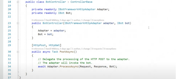 为了创建聊天机器人,Mikhov使用了Visual Studio提供的Empty Template,它包括几种类型的控制器:BotController和NotifyController。