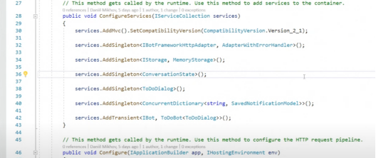 转到Startup.cs选项卡,查看它的内容。在这里可以看到注册的错误处理程序AdapterWithErrorHandler。如果错误发生在程序中,应用程序对错误的反应是必要的。注意注册ConversationState——使用它来让聊天机器人了解正在与哪个用户交流,以及在对话的哪个阶段。