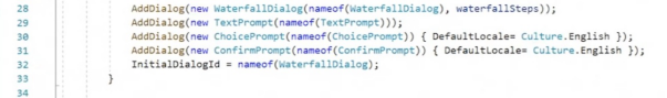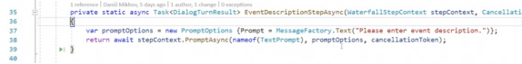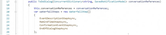 以下看看ToDoDialog.cs选项卡的内容。Mikhov声明了waterfallSteps,这是瀑布对话框的一组步骤,已经在上面提到过了。在waterfallSteps中,指定在每个步骤中使用哪些异步函数来构建用户和聊天机器人之间的对话。
