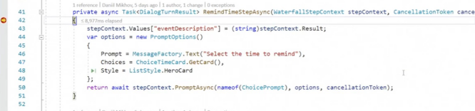 注意stepContext的使用。它保存关于对话框的所有信息,记录中间值。为了实现可能的提醒时间列表,使用了ChoicePrompt。这个方法将为用户提供三个选项和一个可能的提醒时间(2分钟,5分钟,或第二天的同一时间)。本来可以有更多的选择,但只选了三个。