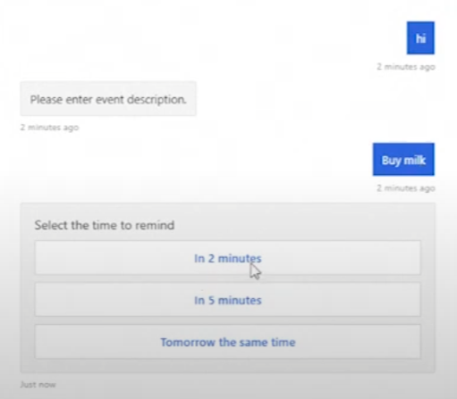 现在,当调用聊天机器人时,它将返回以下文本:请输入事件描述。在声明想要进行提醒的事件(例如买牛奶)后,调用第二步的代码,在这里,聊天机器人将提供三个提醒时间选项中的一个: