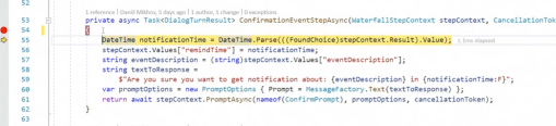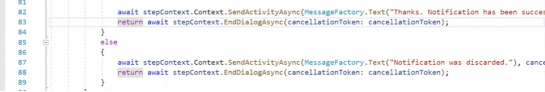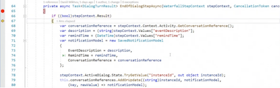最后一步是从stepContext中取出之前填写的信息,并生成一个SavedNotificationModel,必须向其添加一个conversationReference。如果没有它,聊天机器人将无法恢复与用户的对话,也无法确定是哪个用户专门解决了这个问题。