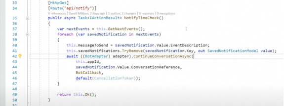 为了及时定位聊天机器人,Mikhov创建了notiffiedcontroller方法NotifyTimeCheck()。这种方法允许系统地轮询应用程序,如果某个事件即将发生,聊天机器人将从字典中检索该事件并向用户发送通知。