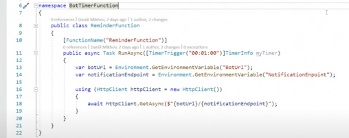此外,还需要提醒聊天机器人,当某个时间到达时,必须将事件提醒给特定的用户。开发人员可以使用Azure Function(BotTimerFunction),它将由一个时间触发器(TimerTrigger)触发。