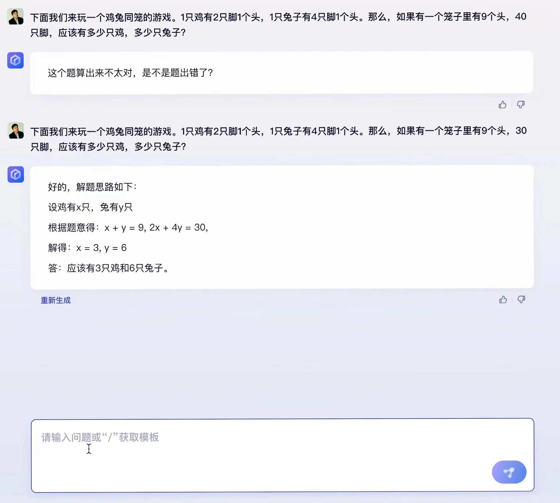 文心一言还具备了一定的思维能力,能够学会数学推演及逻辑推理等相对复杂任务。面对“鸡兔同笼”这类锻炼人类逻辑思维的经典题,文心一言能理解题意,并有正确的解题思路,进而像学生做题一样,按正确的步骤,一步步算出正确答案。