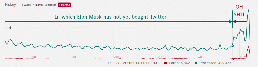 图1. Twitter用户外流对Mastodon作业队列带来的影响