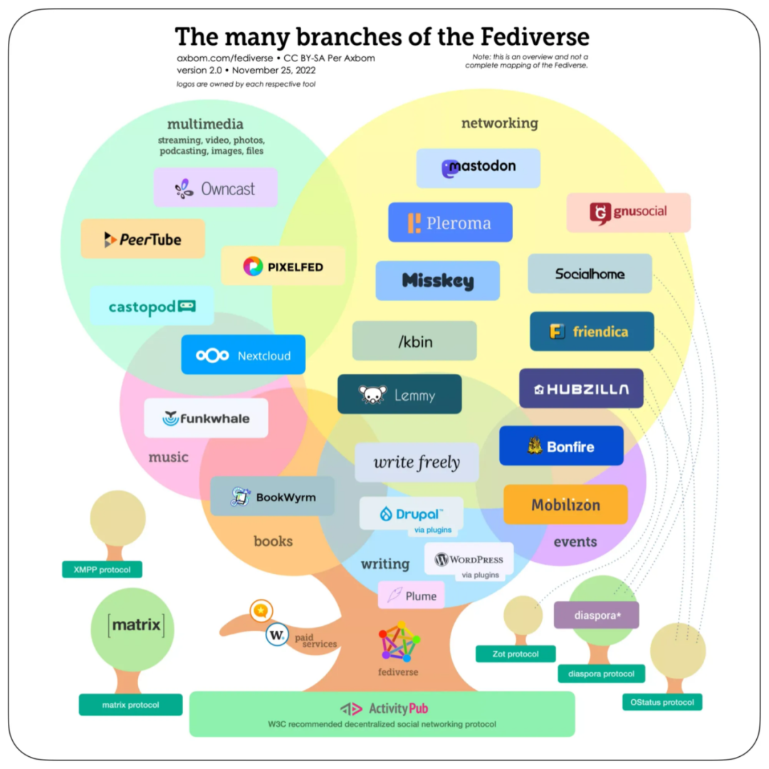 用ActivityPub、OStatus、Zot!和diaspora*等协议结合在一起的联合服务器网络称为Fediverse。Fediverse上的服务器(名为“实例”)与其他实例联合起来,这样就获得了如同集成社交网络的用户体验。每个实例管理各自的操作和安全。