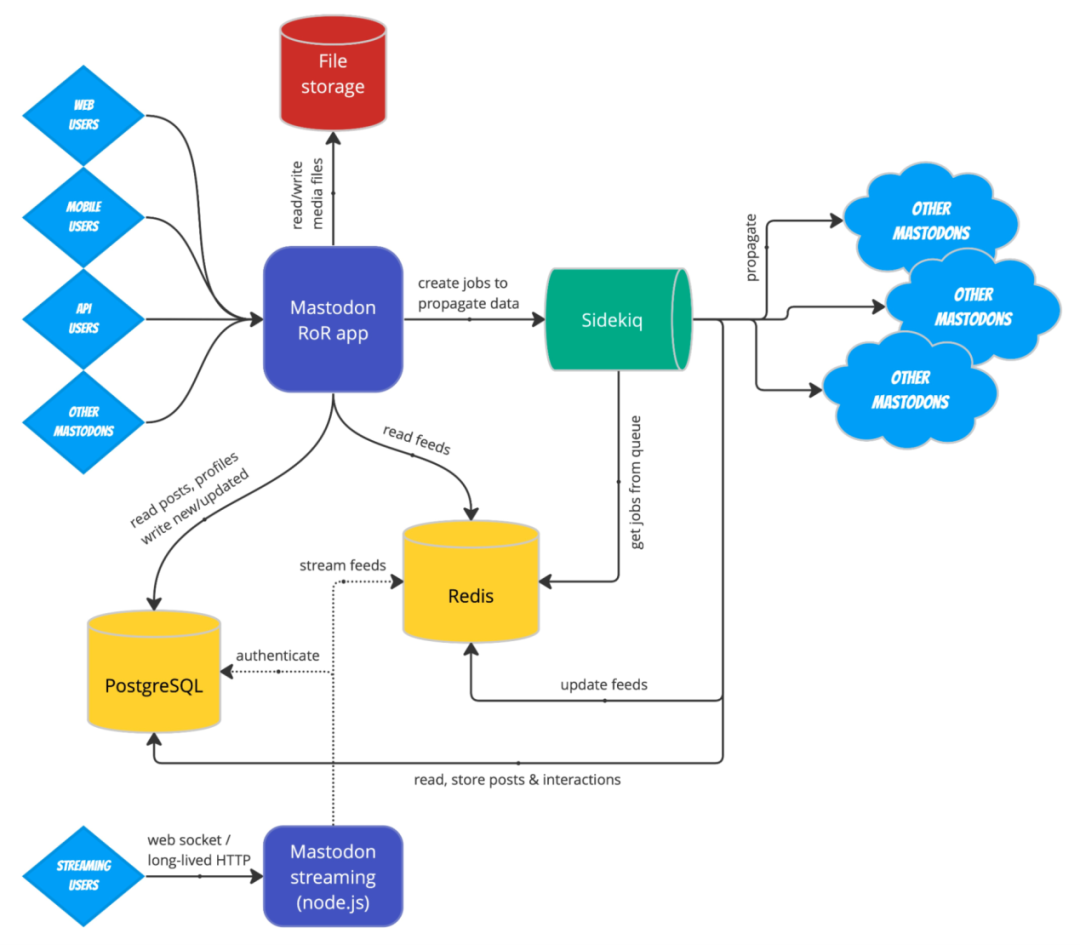 Mastodon是一种带有React.js前端的Ruby on Rails(RoR)应用软件。它遵循这些框架的标准实践。若要运行Mastodon,您需要Ruby、Node.js、PostgreSQL、Redis和SMTP服务器。Sidekiq是RubyGems。添加另外几项服务,比如NGINX和Cloudflare,就能提升Mastodon的可扩展性和抵御DDoS攻击的能力。