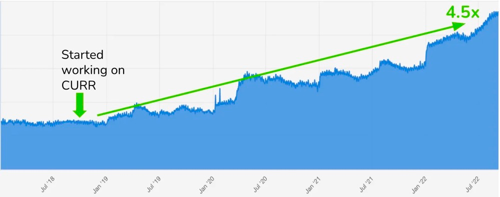 在长达 4 年的努力后,我们将产品的 CURR 提高了 21%,这意味这我们的核心用户每日流失率减少了 40% 以上。结合其他的成功方法,我们的 DAU 增长了 4.5 倍。
