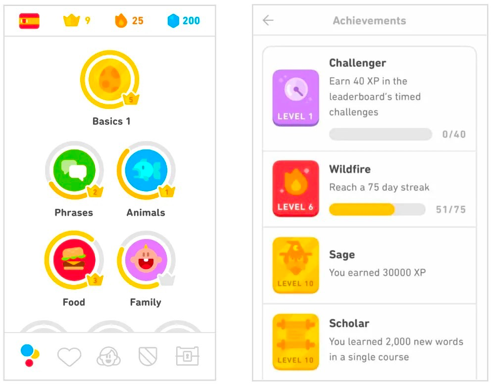 「Duolingo」主界面/成就界面的游戏化设计|图片来源:「Duolingo」