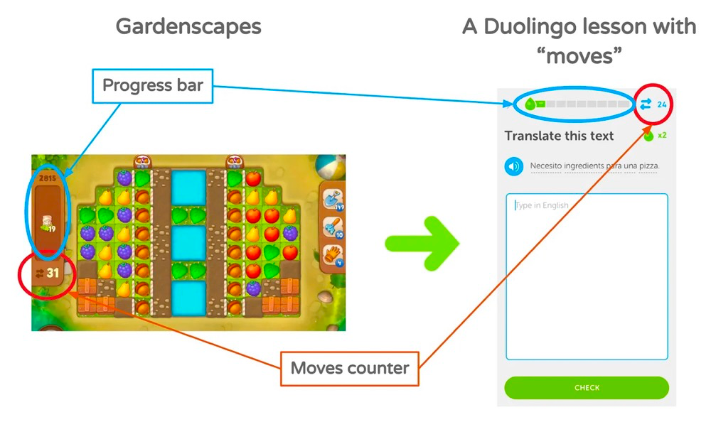 如下图所示,「Duolingo」的课程界面和「梦幻花园」的关卡界面在不少地方有相似之处的。例如两款产品都选择用进度条的形式,让用户知道自己的学习和游戏进度。不同的是,「梦幻花园」选择了进度条与操作计数器结合的方式,增强紧迫感。发现这一点后,我们在「多邻国」中也加入了计数器的设计,让用户回答课程问题的次数有上限,如果没有在规定次数内答对,就需要重新学习这部分内容。