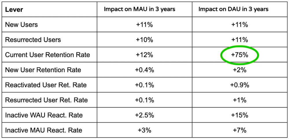 决定攻克 CURR 使公司的战略发生了巨大的转变,我们放弃了一些之前很重视的指标,比如新用户留存。同时,这一次测试结果也让我们意识到,一个相同的指标,对产品DAU和MAU的影响竟然存在如此大的差距。比如在同样的提升速度下,CURR 对 DAU 的影响是对 MAU 影响的 6 倍,分别为 75% 和 12%。iWAURR(今日未登录的周活跃用户重新激活率)是撬动 DAU 增长第二好的杠杆,但对 MAU 的影响却远远小于直接提升新用户和回流用户数的效果。