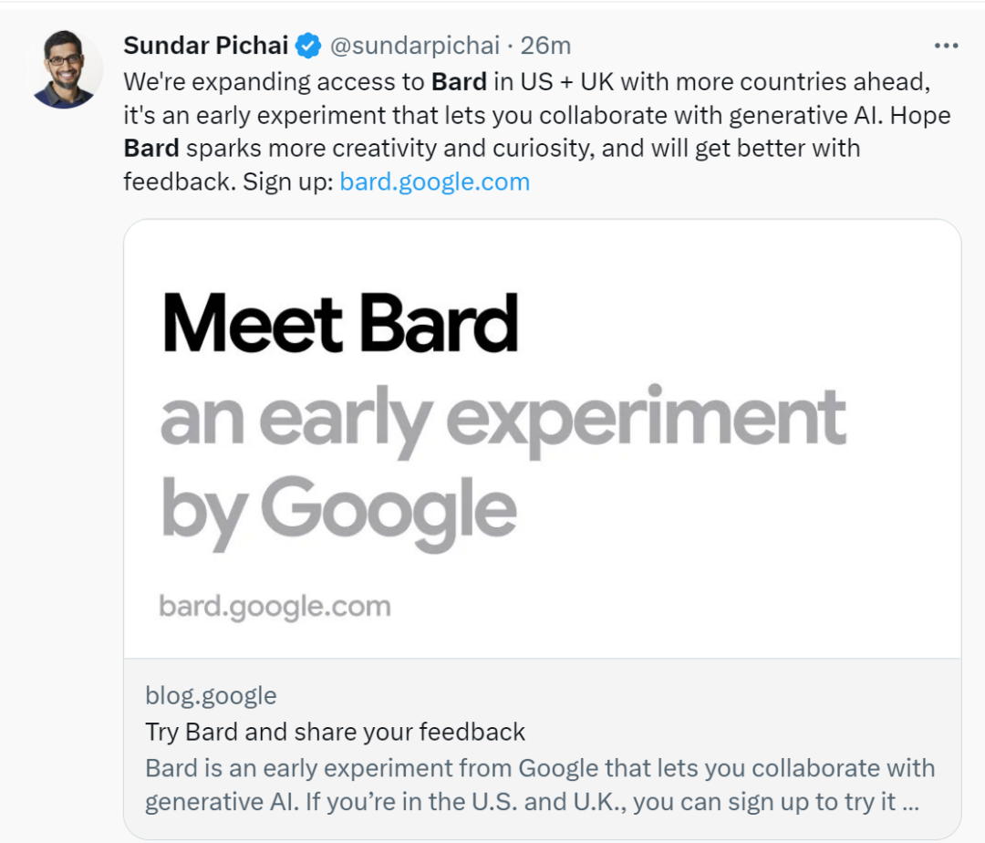 刚过去的一周,我们刚经历了三场对话式AI的大事:OpenAI的GPT-4,微软Office 365“核弹式”升级,百度的中文语言大模型“文心一言”,谷歌终于坐不住了,21日,谷歌首席执行官Sundar发消息称Bard开启公测!