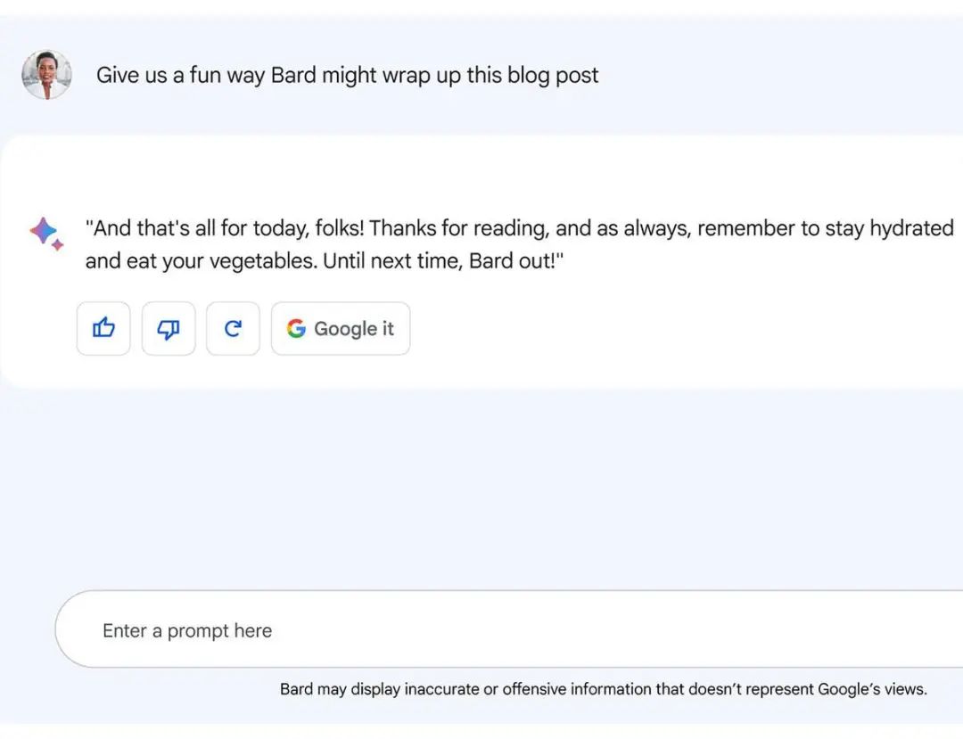 同时,我们也会注意到界面上会有提示:“Bard 可能会展示不准确或者冒犯的信息,并不代表谷歌的观点。”