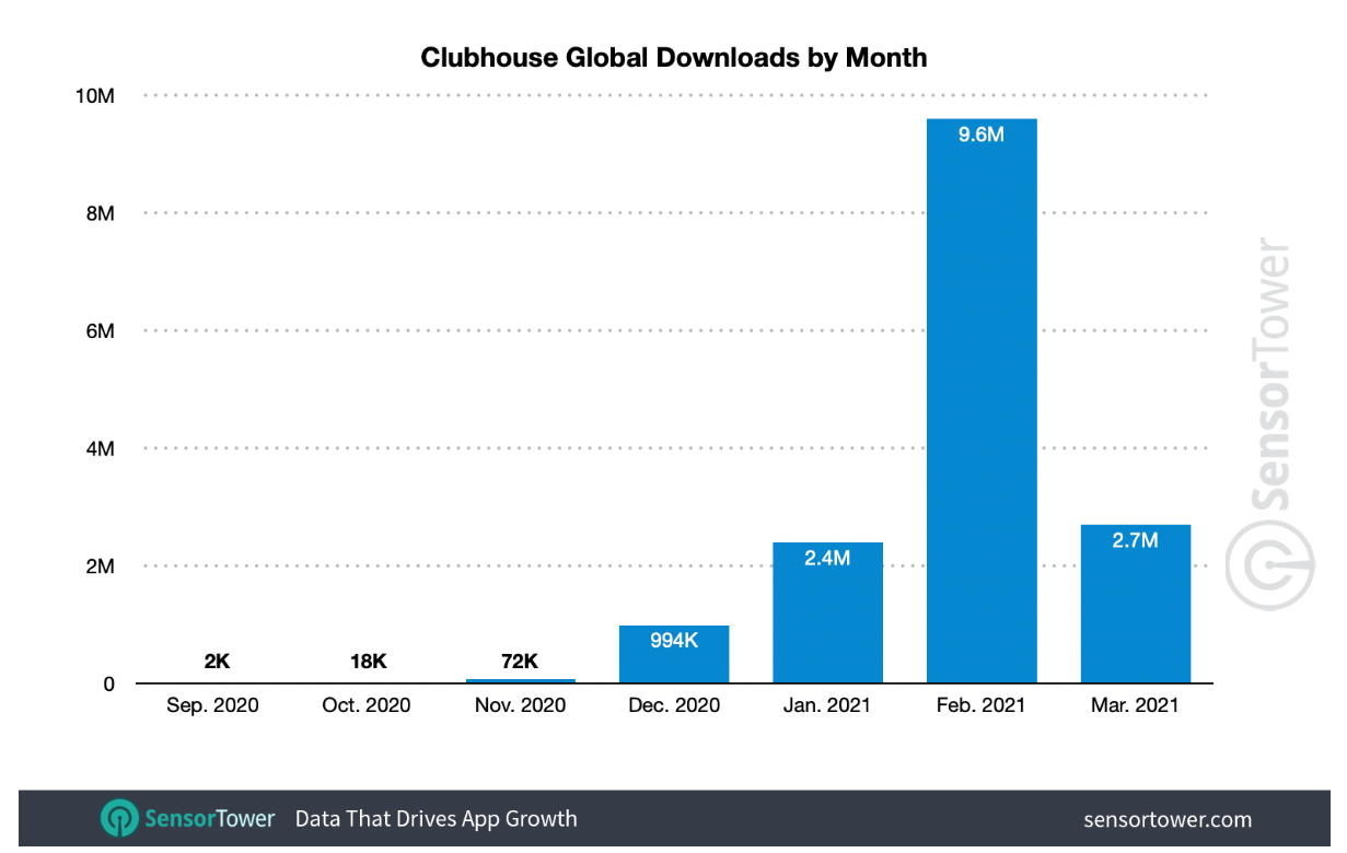 2021年2月,Clubhouse下载量达到顶峰 图源:Sensor Tower