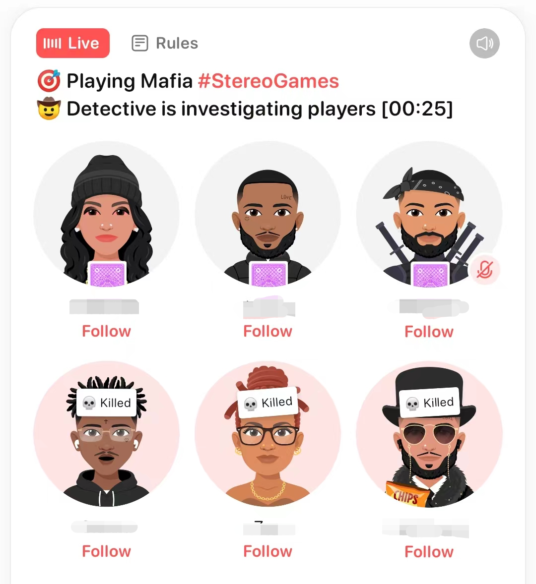 除了即时发送的“声音卡片”外,Stereo还增加了语音游戏版块,提供“Who am I”、“Buzzword(猜词语)”、“Mafia(找卧底)”等可供多人玩耍的游戏,均为不需要借助屏幕互动、连麦即玩的小游戏。