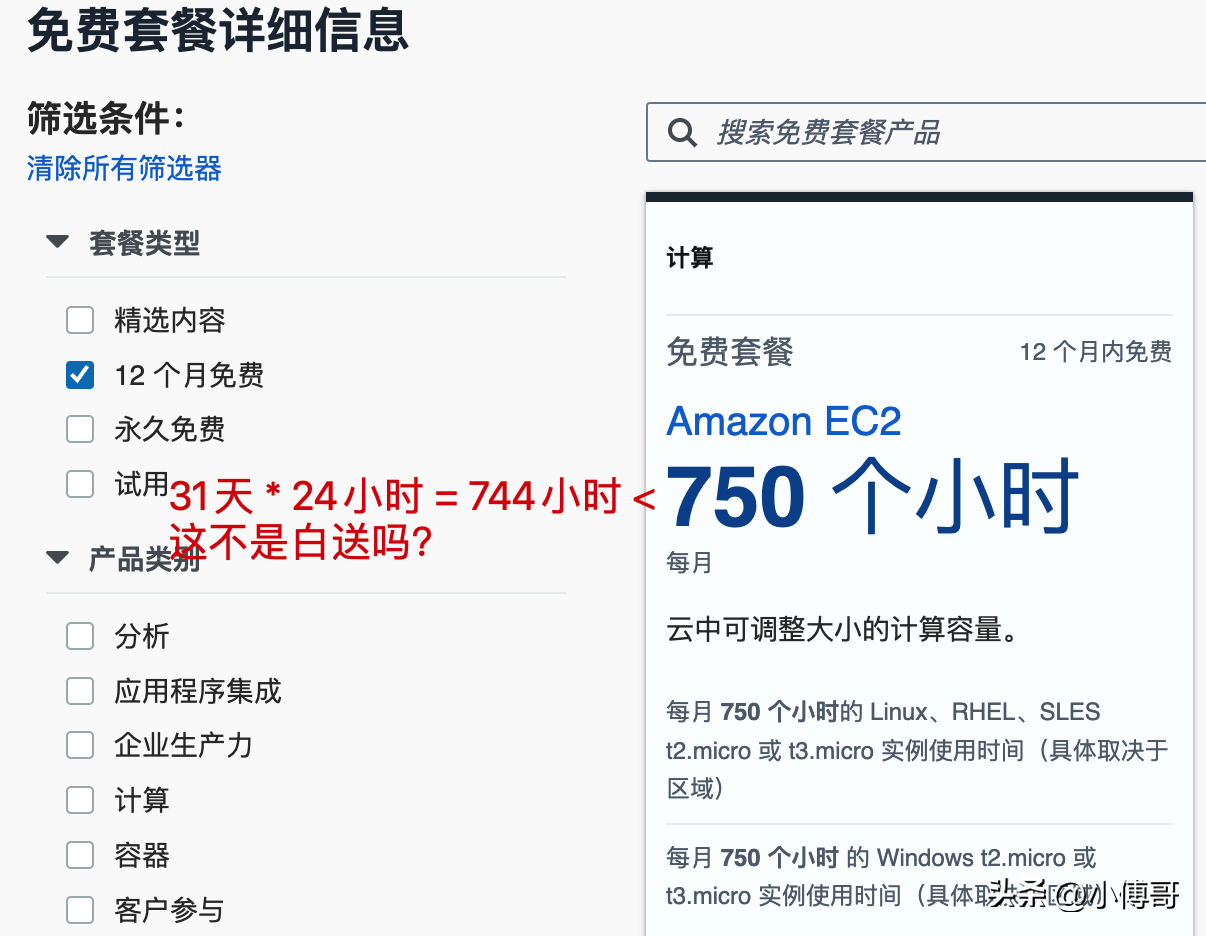 这里小傅哥感兴趣的就是 Amazon EC2 云服务器,每个月免费750个小时。这一个月31天✖️24小时不也才744小时,所以这和免费有啥区别? 难道一天能加出来25个小时班?