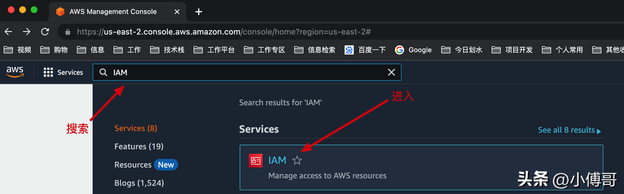 地址:https://us-east-1.console.aws.amazon.com/iamv2/home?reginotallow=us-east-2#/home - 搜索 IAM 并进入,就是控制面板了。