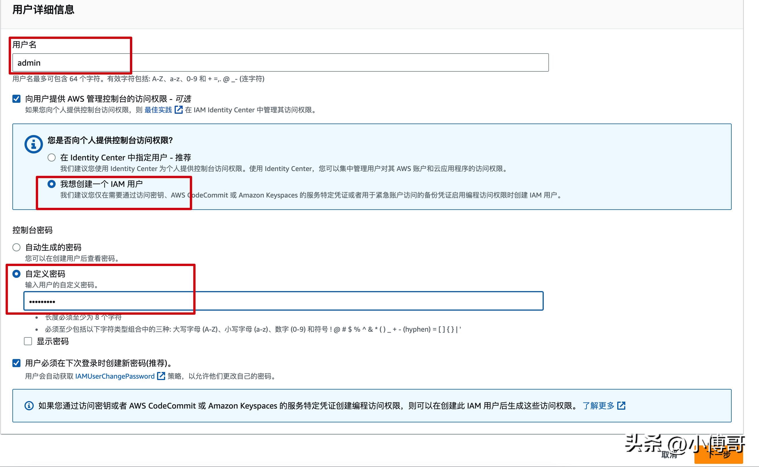 说明:首先你需要在IAM控制面板下的访问管理中的用户下,创建一个自己的用户。你可以创建用户名为 admin 或者其他。
