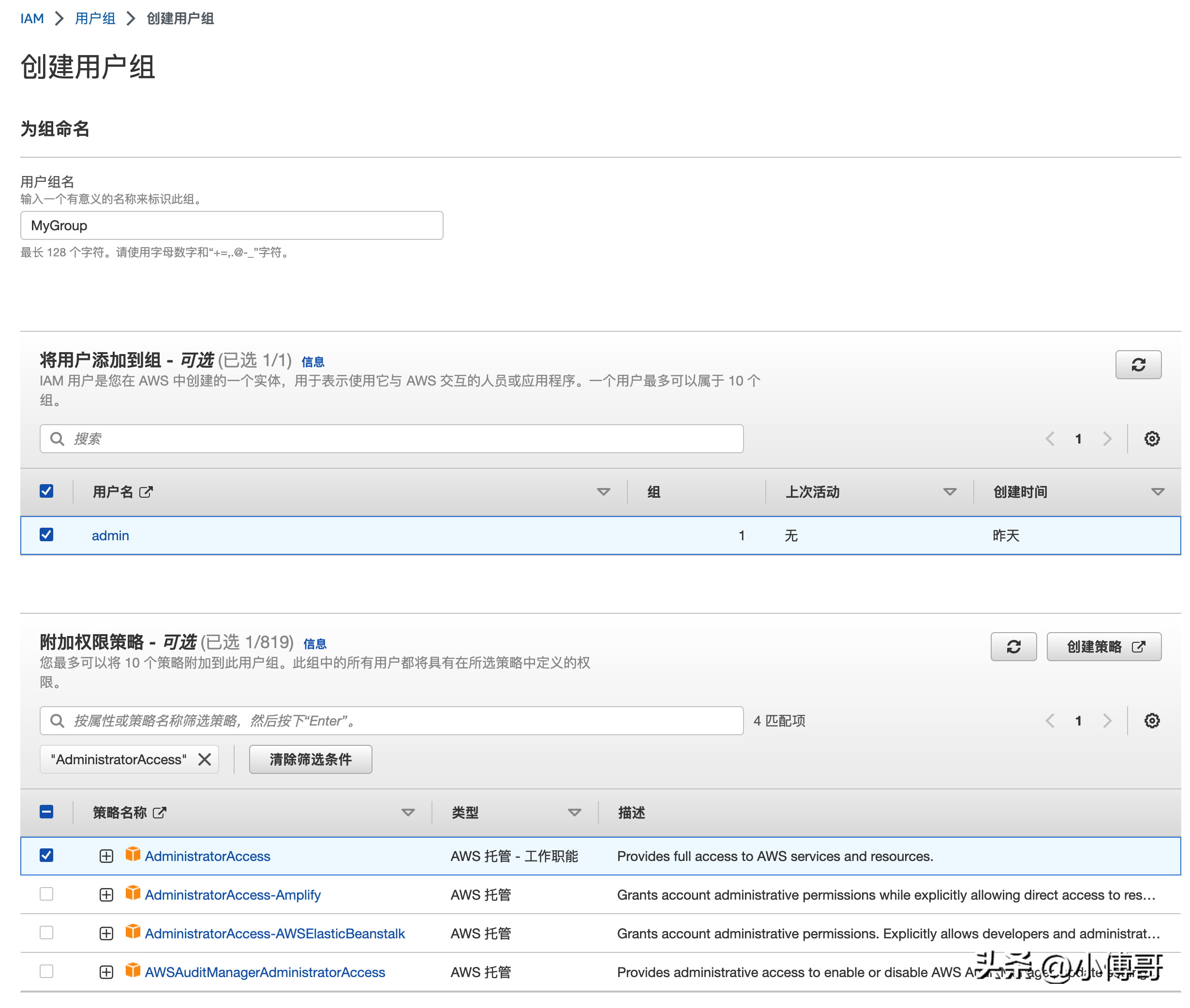 说明:在用户组的创建中,写上组名、添加上刚才创建的用户admin,之后再搜索AdministratorAccess为这个组的用户进行授权。
