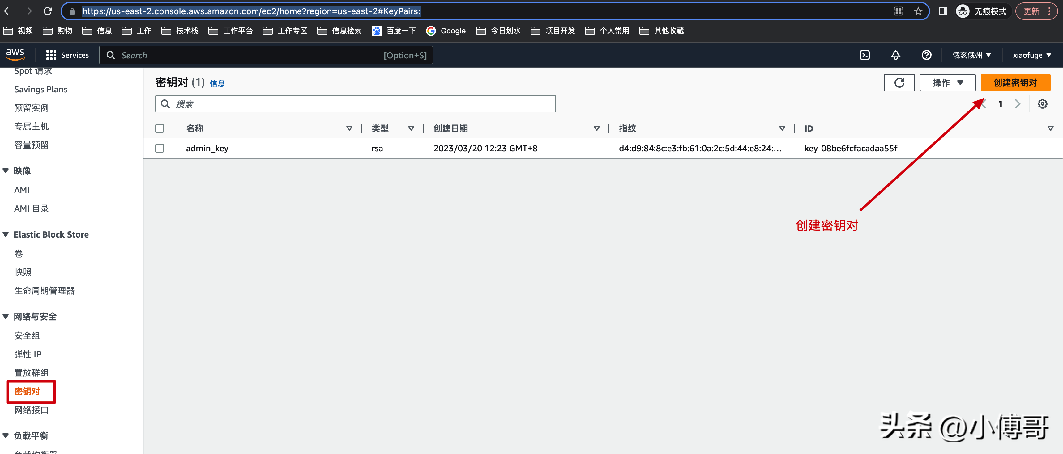 地址:https://us-east-2.console.aws.amazon.com/ec2/home?reginotallow=us-east-2#KeyPairs: - EC2 管理控制台。