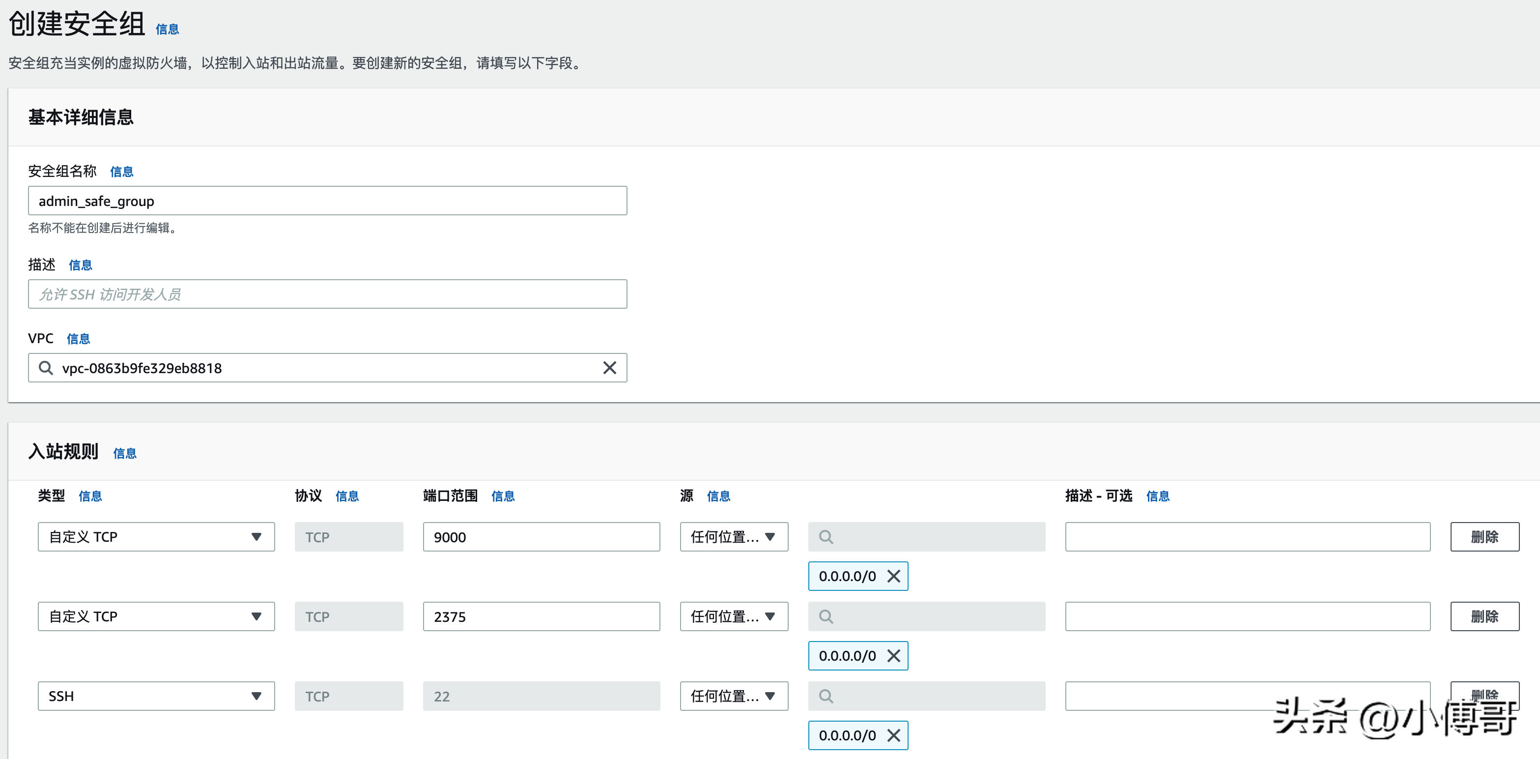 用于访问服务器的端口都需要在安全组中开通,比如 SSH 22、Portainer 9000、Docker 2375 所以需要自己创建一个安全组。