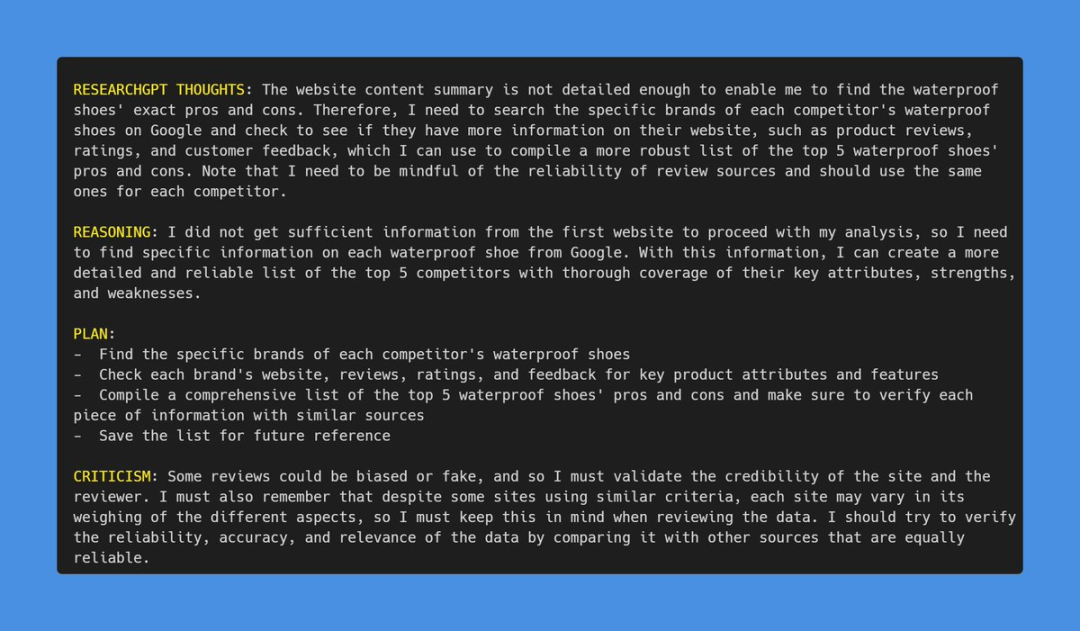 接下来我们再看一个例子。假装自己经营一家鞋公司,给 AutoGPT 下达的命令是对防水鞋进行市场调查,然后让其给出 top5 公司,并报告竞争对手的优缺点 :