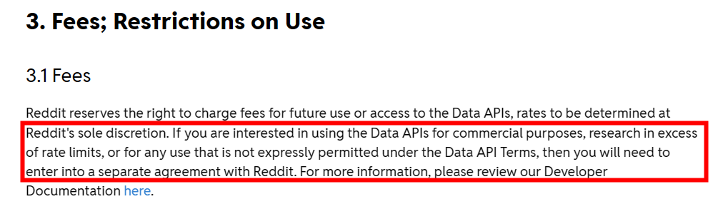 值得注意的是,在Reddit数据API条款中的第三条,明确的提出了费用和使用限制的问题。该公司认为,除了商用用途以外,学术界、研究人员和“社交聆听工具”也使用它来访问Reddit数据,但有些人过度使用它。Reddit会保留访问API收费的权利,费率会由Reddit独家确定。