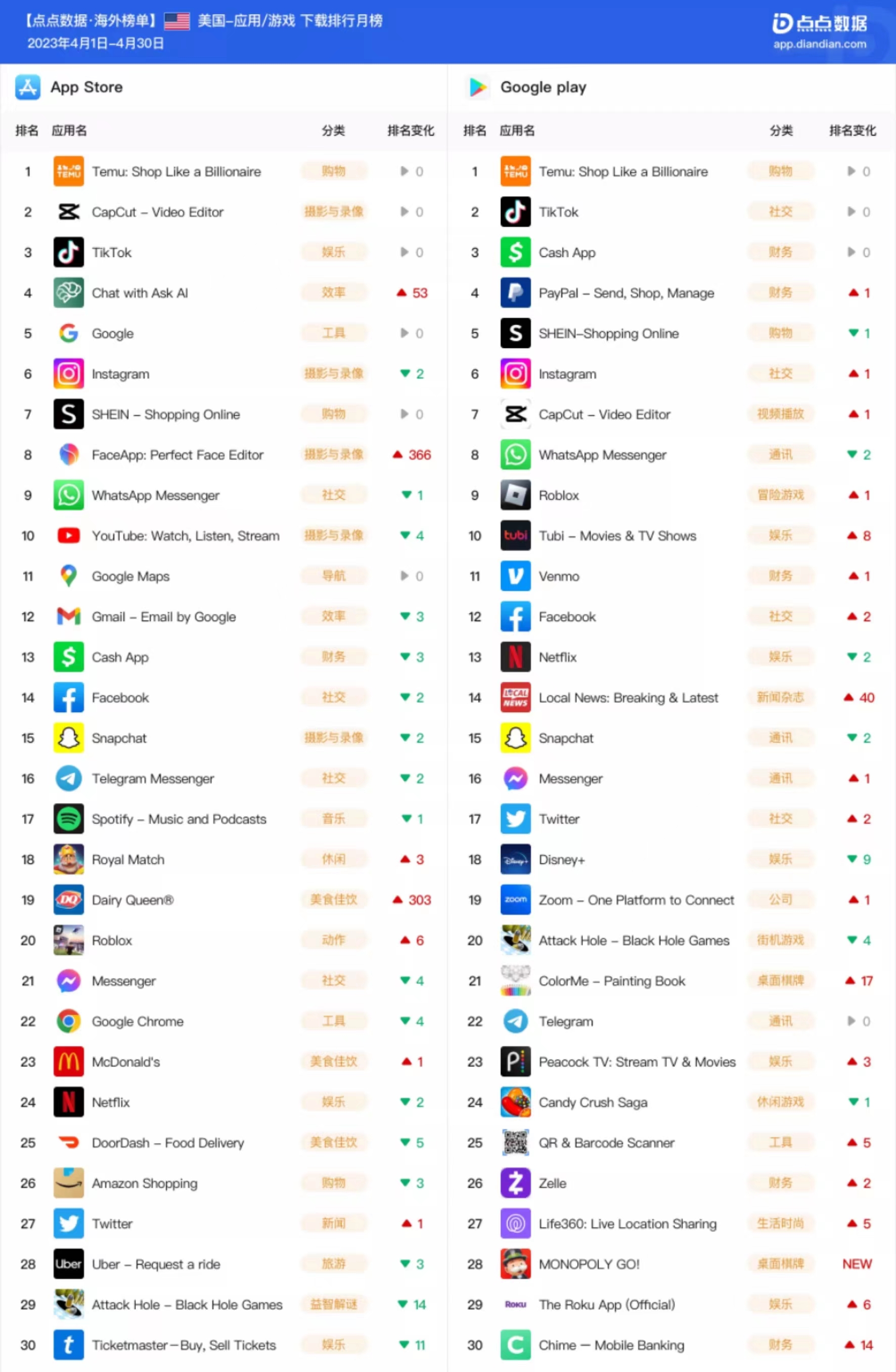 原标题:美国4月榜 | AI相关app频出爆款;大富翁手游版上线当月下载量超223万