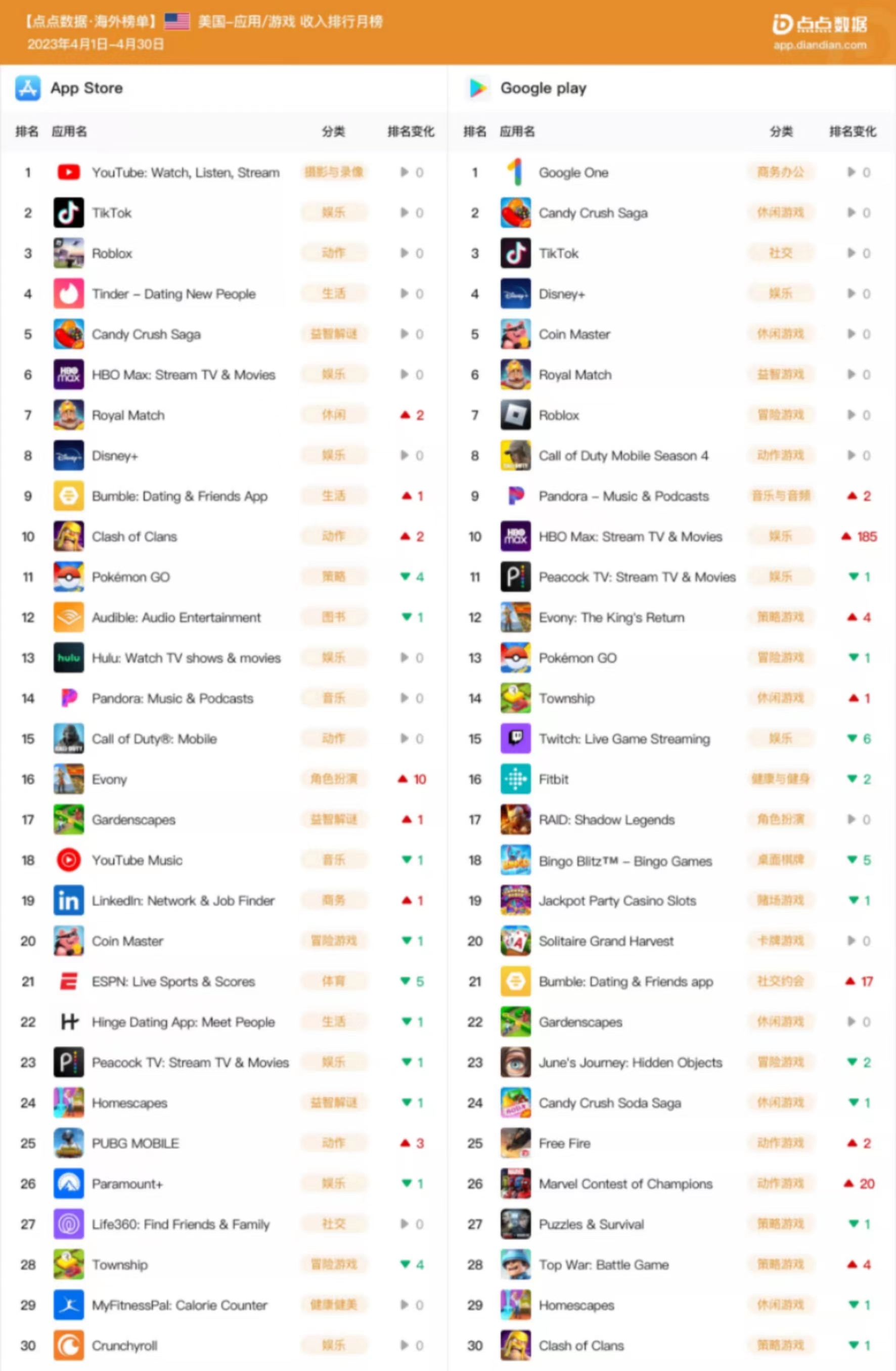 统计周期内,4 月双平台收入榜头部应用几乎未出现排名变动,但从预估收入数据看皆有些许下滑,App Store 平台这边依旧是《YouTube》蝉联收入榜榜首,其 4 月预估收入超过 2757 万美元。而 Google Play 这边,榜首同样是《Google One》,上月其预估收入超过 4013 万美元。
