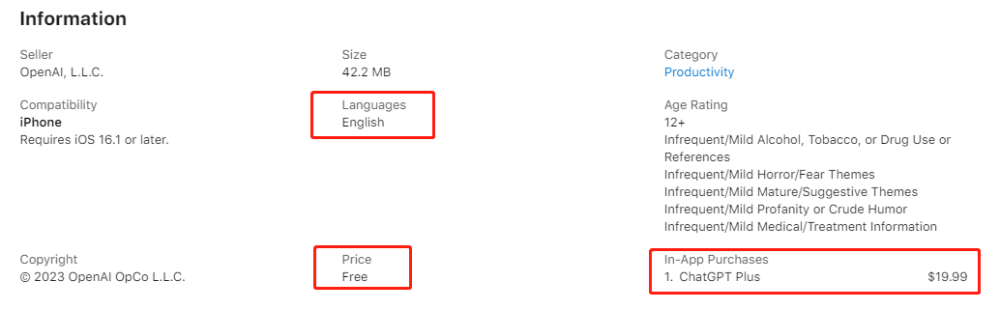 根据苹果官网,该应用仅支持英语,年龄分级为“12岁以上”。下载应用是免费的,但会提供App内购买项目——目前仅有售价19.99美元的“ChatGPT Plus”。