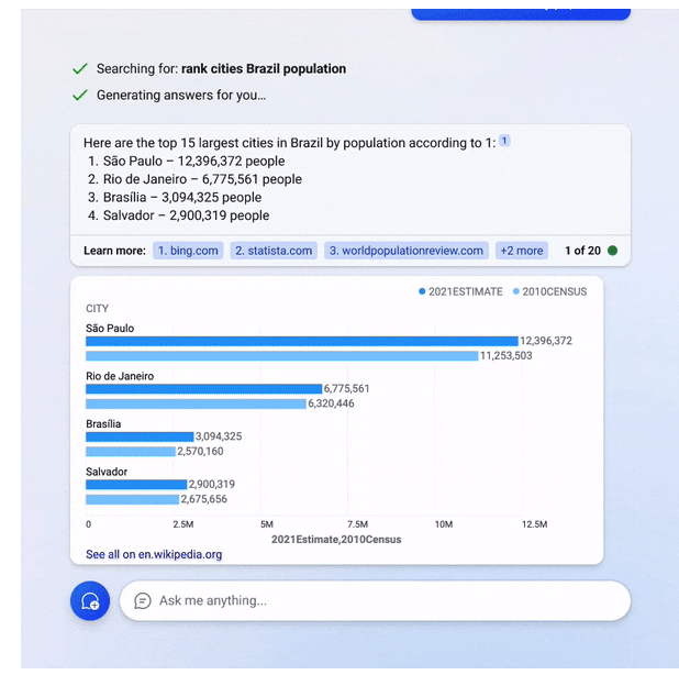 微软表示使用更多视觉元素来帮助使聊天答案更加完整。询问“MSFT 的股价是多少?”或“按人口对巴西的城市进行排名”,必应聊天将生成一个图表。