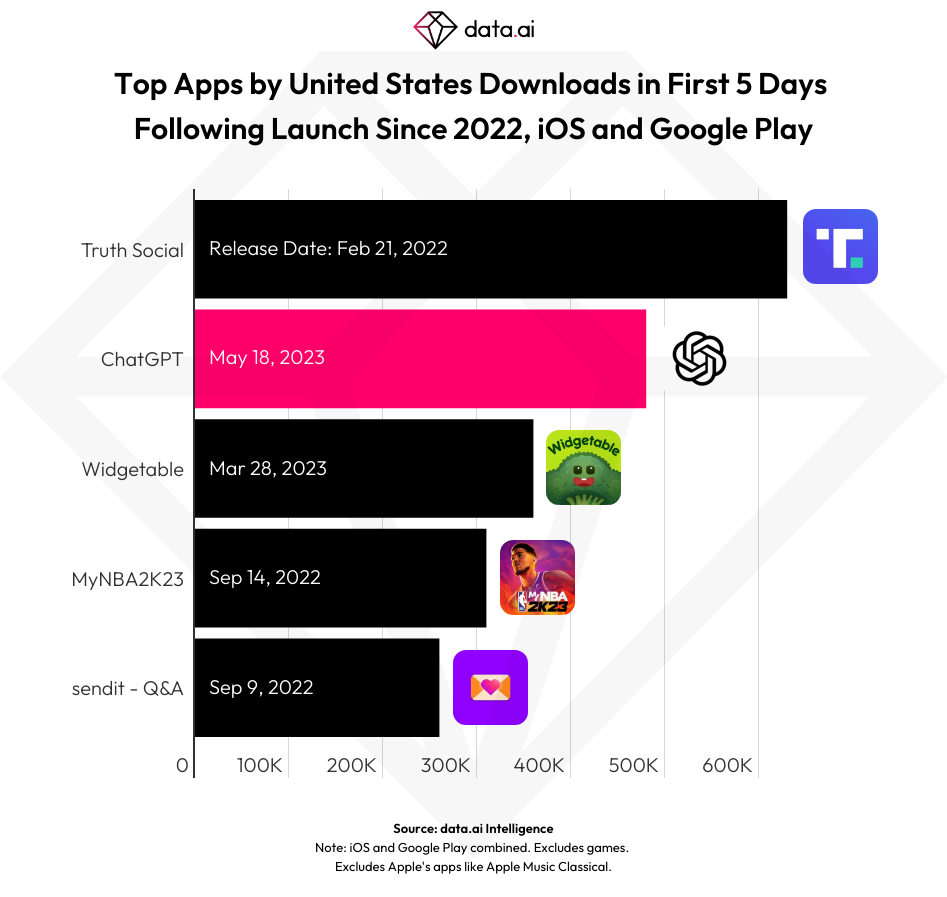 这使得ChatGPT成为今年和去年表现最好的新应用之一,仅次于2022年2月推出的由特朗普支持的Twitter克隆版「Truth Social」。