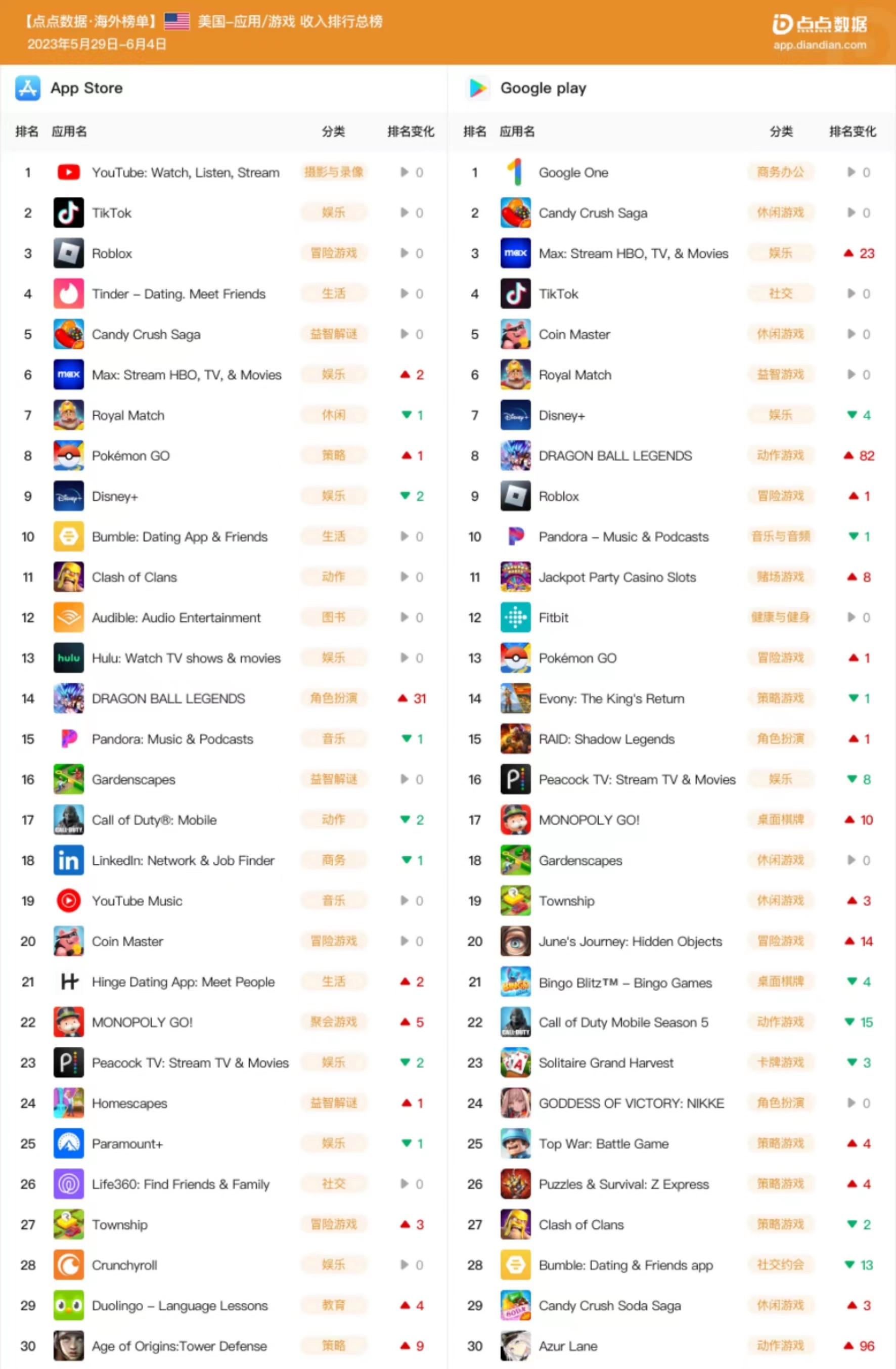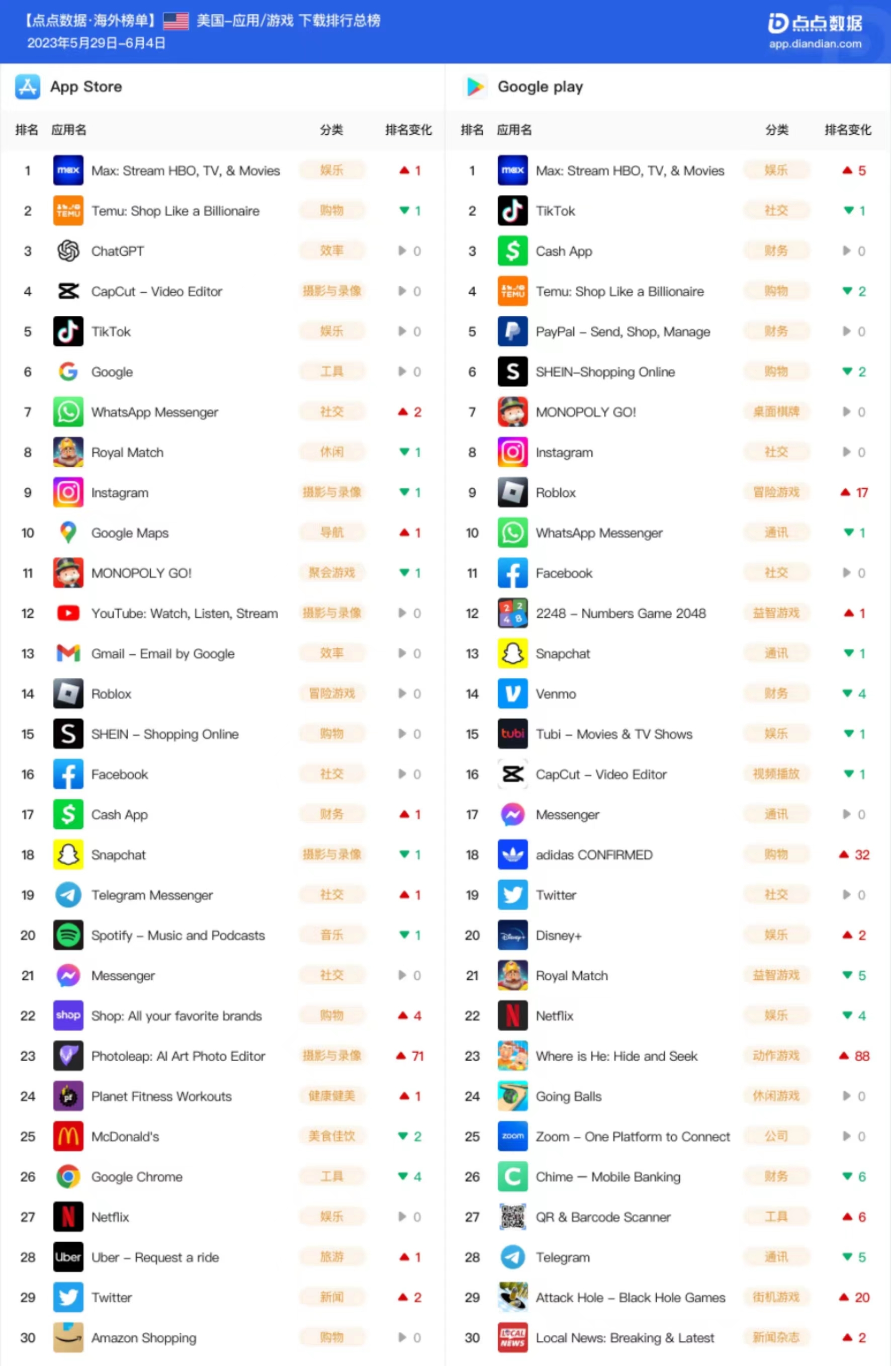 依托互联网移动应用大数据平台“点点数据”,点点出海基于美国 App Store 和 Google Play 两大应用市场,分别整理下载榜和收入榜 Top30 应用,希望帮助从业者更好地了解海外最新的产品趋势和变化。