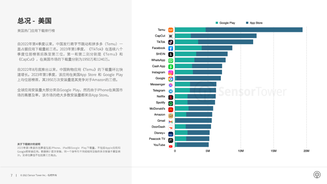 随着 SHEIN 的安装量在 2023 年第一季度快速上升,美国下载量最高的五大应用中首次出现了四个中国应用;同时,SHEIN 在全球多个市场备受欢迎,位列全球热门应用下载榜第 11 名。《Attack Hole》以近 3700 万的下载量首次进入全球移动游戏下载榜前十名。