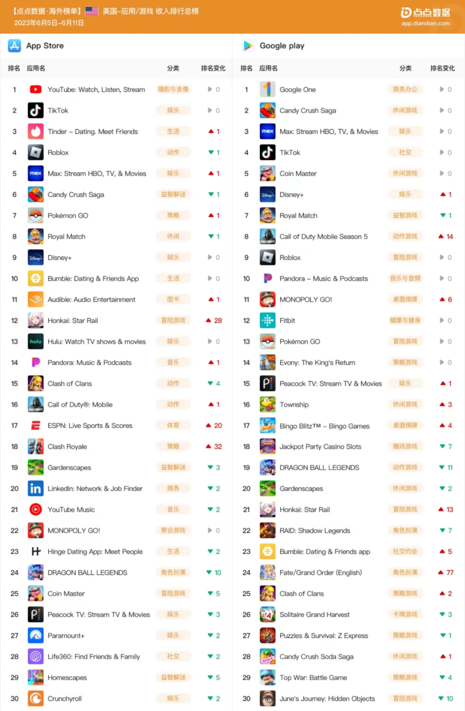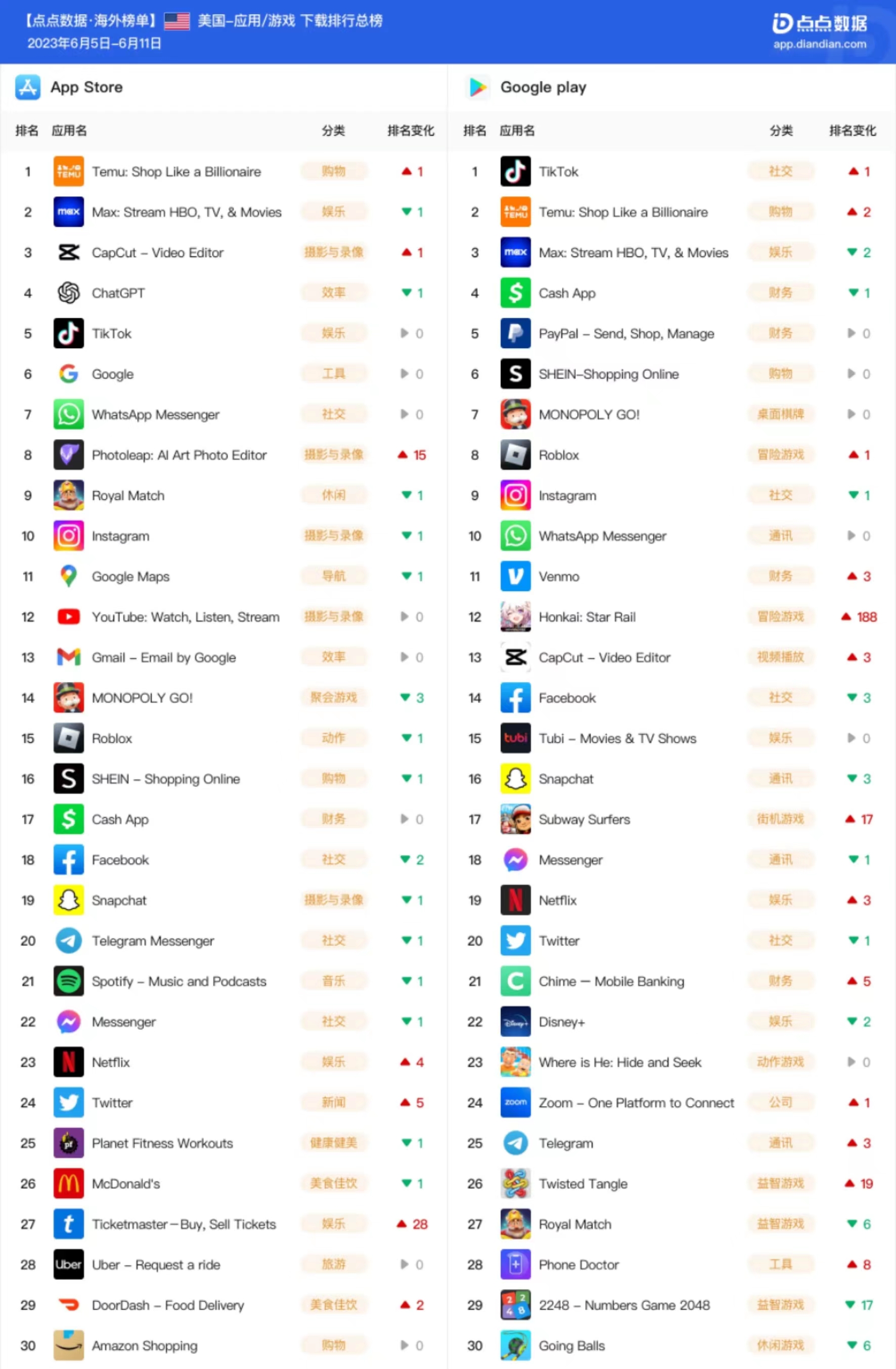 依托互联网移动应用大数据平台“点点数据”,点点出海基于美国 App Store 和 Google Play 两大应用市场,分别整理下载榜和收入榜 Top30 应用,希望帮助从业者更好地了解海外最新的产品趋势和变化。