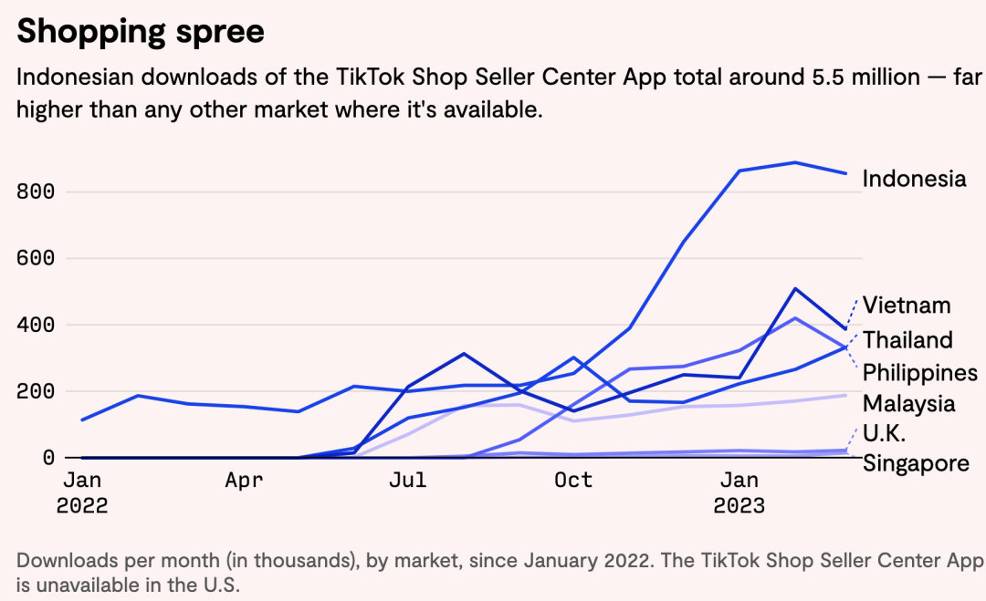 上图数据显示,如果除去新加坡及英国市场,在印度尼西亚、越南、泰国、菲律宾以及马来西亚,TikTok Shop 卖家中心 App“TikTok Shop Seller Center”的下载量都呈现上升趋势。其中,在印尼市场,截至 2023 年 3 月 1 日,TikTok Shop 卖家中心 App 的总下载量约为 550 万次,远高于 TikTok Shop 其他任何一个市场。