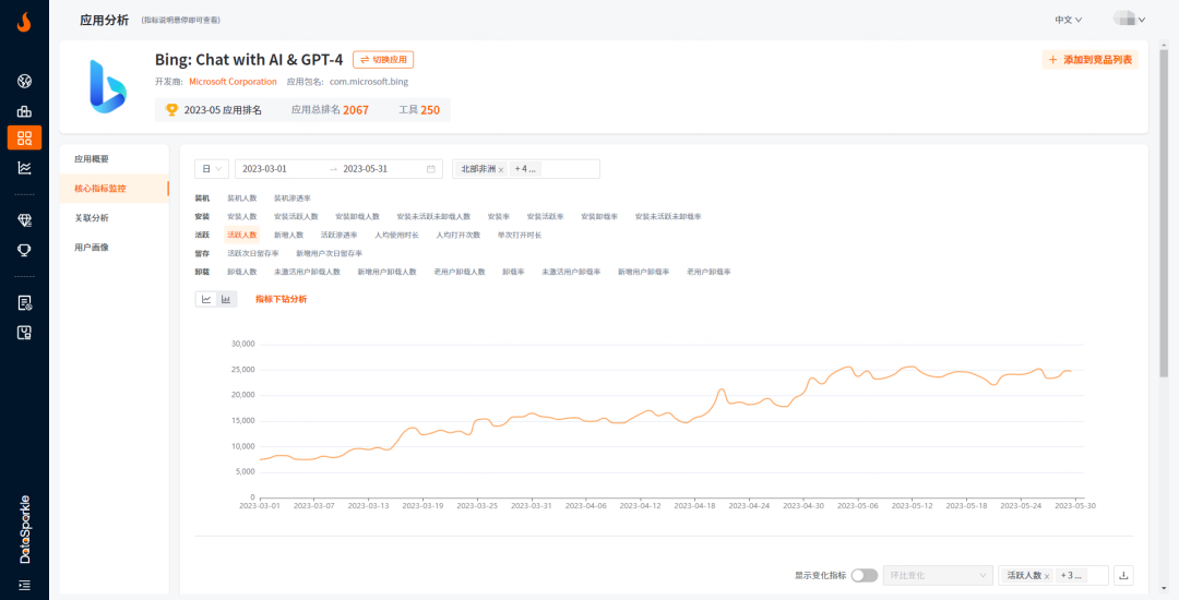DataSparkle 应用分析数据显示,在更新后,《Bing: Chat with AI & GPT-4》在非洲市场日活用户规模也快速上升,截至 6 月 6 日,其日活用户数量超过 2.6 万。