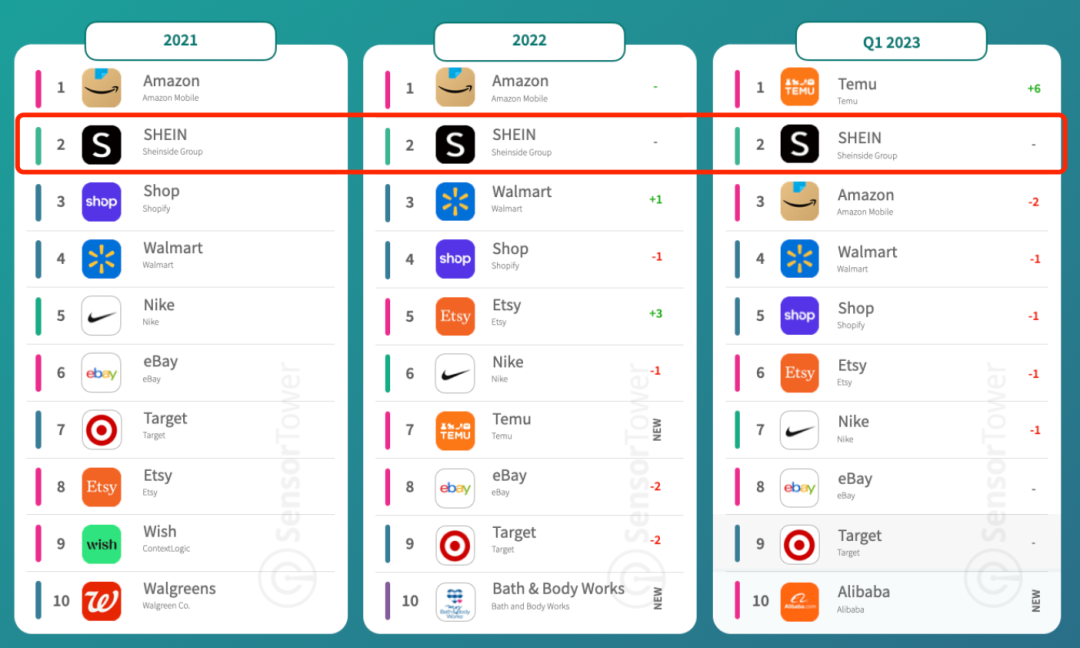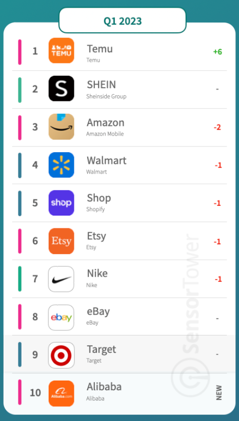 根据 SensorTower 的榜单,2023 年一季度,美国市场电商类 App 下载榜(AppStore+Google Play),Temu 排名第一,Shein 排名第二,另一个中国电商巨头阿里巴巴排名第十。美国本土电商的领头羊,亚马逊、沃尔玛、Shop(Shopify),位列三至五位,Etsy、Nike、eBay、Target,则位列六至九位。