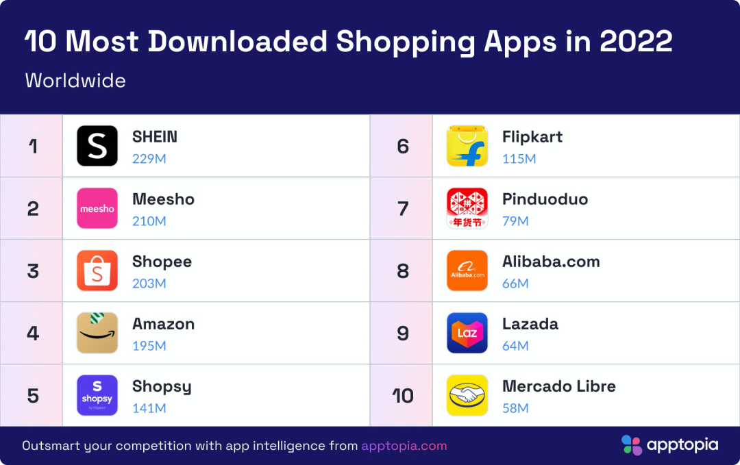 在全球市场,根据 2022 年 Apptopia 全球 App 下载榜单出炉,Shein 是 2022 年全球下载量第一名的电商购物类 App!